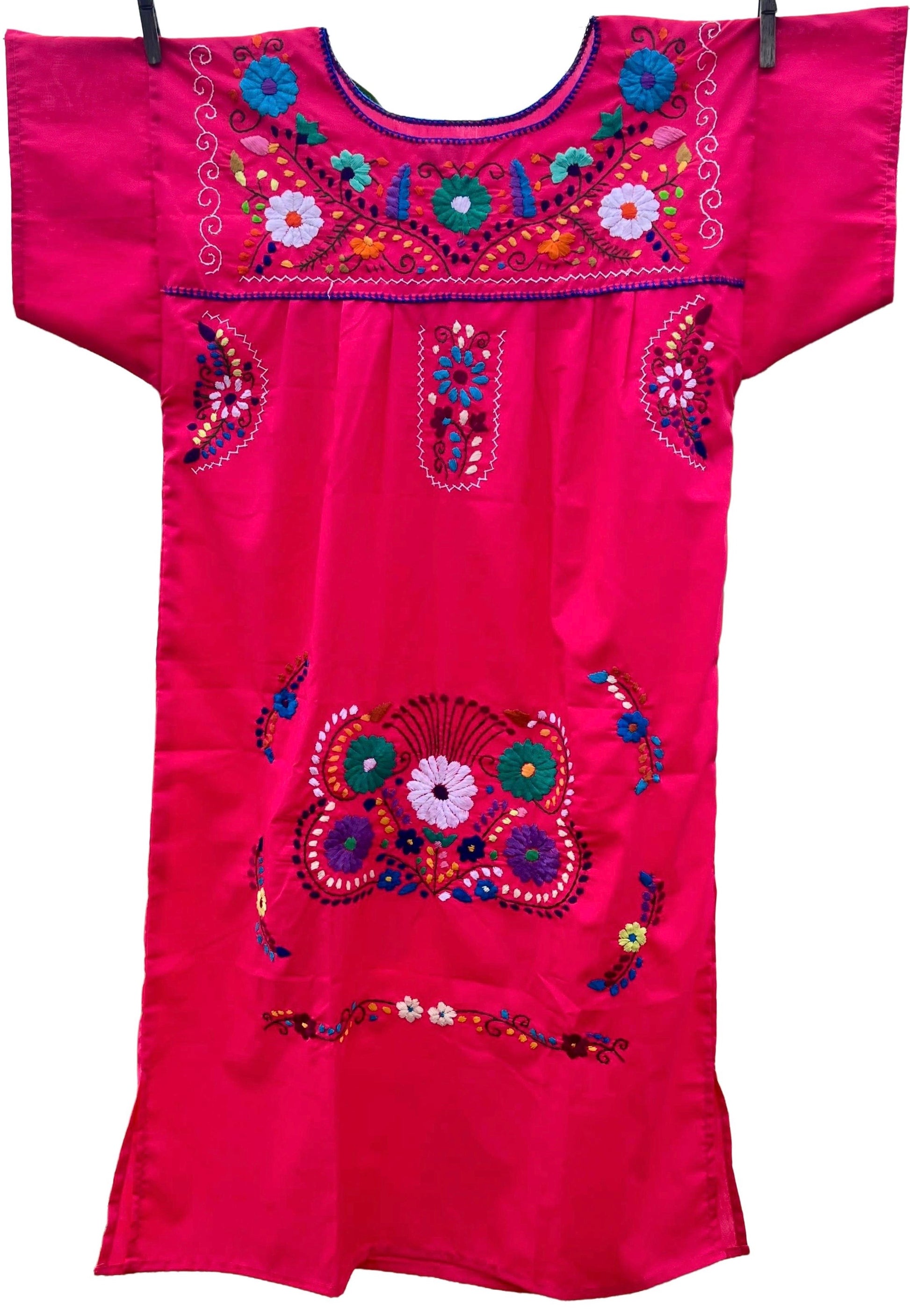 Vestido largo confeccionado en tejido de popelina, decorado con flores tradicionales bordadas a mano mediante la técnica de pepenado fruncido en hilo de colores, realizadas por artesanos. Además de los bordados en la parte frontal, tiene detalles bordados en la parte superior de la espalda.